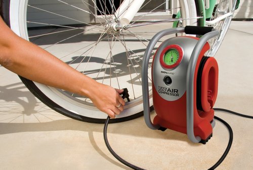 Bon-Aire Industries 120 Volt Air Compressor features a handy carrying handle for ease of use. The powerful 120 volt motor inflates a P185/R14 vehicle tire from 0 to 30 PSI in less than 2.5 minutes. It's also ideal for use in inflating all vehicle tires; from bicycles to motorcycles, cars to RV's, SUV's, trucks and more. Features a built-in lighted pressure gauge for easy reading. The 4.5 foot rubber air hose with clamp-on tire valve and 4.5 foot power cord offer a total usable reach of 9 feet. Includes an accessory compartment, with seven inflation accessories as well as five high-flow accessories, a ball inflation needle and three presta valve adapters. The built-in power cord and air hose wraps make storage a breeze. Bon-Aire has the most complete line of 12 volt and 120 volt inflators in the industry.