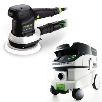 6" Sander has a short 1/8" stroke for fine finish work and is well balanced for smooth, low-vibration operation. 2.5 Amp, 6,000 to 10,500 opm. When you need a swirl-free finish, and dont have time for hand sanding or scraping, look no further than the Random Orbit Festool Sander. Random Orbit Sanders are specifically designed for the critical last sanding step before applying the finish. The ETS 150/3 EQ sander features the Festool Multi-JetStream dust extraction system which maximizes abrasive life, a sanding pad brake to prevent scratches when starting or removing the sander from the work piece, stepless electronic speed control to allow precise matching of power to the task at hand, and fatigue-reducing ergonomic design. Includes: ETS150/3 EQ Sander, StickFix Sanding Pad, and a T-LOC Systainer #3 Storage Container. The new CT26 incorporates increased capacity, innovation and versatility into this new design. With the dual mode power activation, the user chooses either a tool activated or manual activated start-up. This CT (Cleantec) unit is extremely mobile, with a sturdy chassis, extra large low abrasion rear tires, and double swivel casters up front to easily negotiate any obstacle. The CT26 dust extractor can be secured in place with a single point foot brake. The filter bags have even been redesigned to be self cleaning. These bags inflate and deflate with the cycling of the unit for maximum suction force and efficiency. An integrated hose garage has been added for easy hose storage. As with all Festool dust extractors, the CT26 utilizes the Sys-Dock system that facilitates the use/storage of one or more Systainers to the top of the unit.. Will work wet or dry with no complex conversion, and is remarkably quiet. Includes: CT 26 E - 6.9 Gallon HEPA Mobile Dust Extractor, HEPA Filter, (1) Fitted Filter Bag, and (1) 1 1/16" x 11.5 Antistatic Suction Hose.